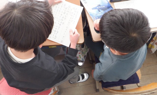 上の写真は、5年生の算数の様子です。割合を使って比べ方を考えていました。学習に臨む真剣さが姿勢から伝わってきて、感心しました。