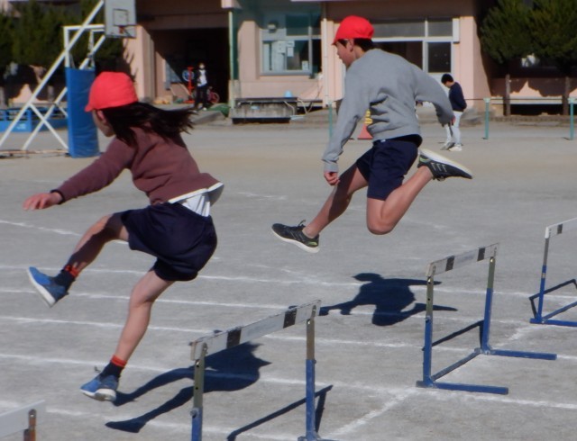 真ん中と下の写真は、6年生の様子です。ハードル走を行っていました。身体の動きや歩数を意識しながら、一人一人が目的をもって取り組んでいました。