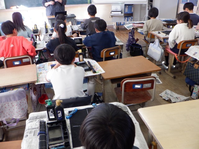 下の写真は、3年生の書写の様子です。毛筆の基本である筆使いを再確認していました。真剣に話を聞いていて、感心しました。