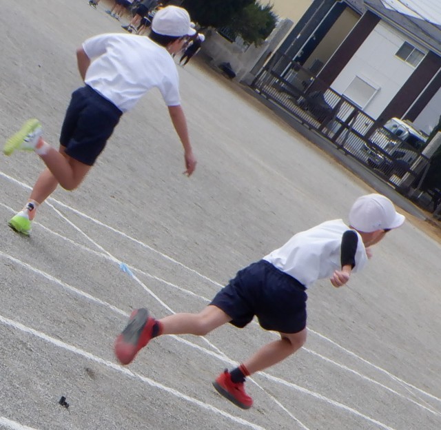 上の写真は、4年生の体育の様子です。友達の声援を受けながら、力いっぱいゴール目指して走っていました。