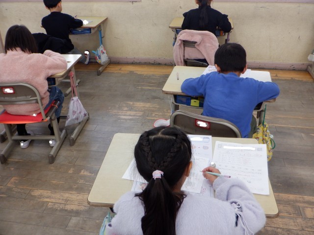 下の写真は、1年生の算数の様子です。単元テストと真剣に向き合っていました。