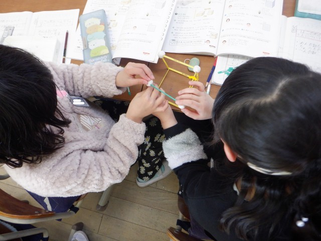 上の写真は、2年生の算数の様子です。棒と粘土玉をつかって、箱の形を作っていました。今後、辺や頂点という算数用語の学習につなげていきます。