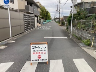スクールゾーンは登校時、子どもたちが多く通るため、車の通行をご遠慮いただいています。