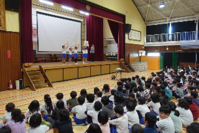今日は2月の全校朝会。1年生の代表が、今月の生活目標「人の話をよい態度で聞こう」の具体的なポイントを、「あ・い・う・え・お」で説明してくれました。