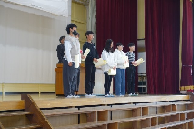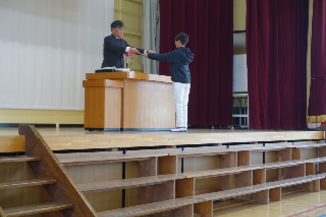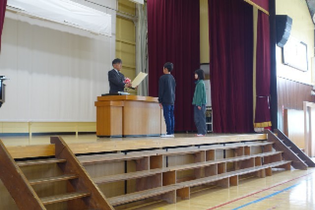 卒業式予行終了後、体育優良児童生徒表彰、産業奨励賞表彰、6ヶ年皆勤賞の表彰を行いました。