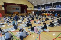 書初め競書会が始まりました。体育館で学年ごとに行います。(写真は3年生の様子です...