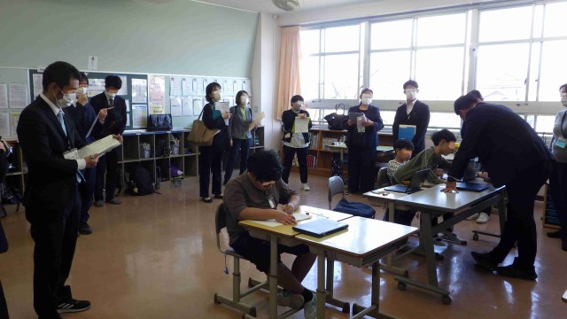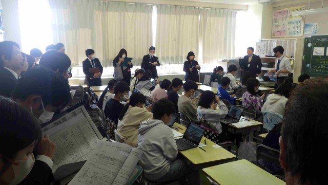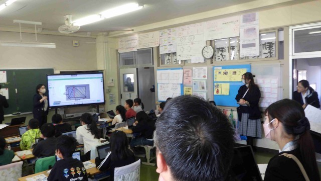 11月28日。3年生の算数では「少数」、5年生の算数では「四角形と三角形の面積」、6年生の算数では「角柱と円柱の体積」、特別支援学級の算数では「垂直、平行と四角形」「四角形と三角形の面積」取り組んでいました。小数点の数をいろいろな表し方であらわす、知っている図形にして面積を求める、変わった図形の体積を求める時の考え方、図形の仲間分け、三角形の面積の求め方を使って考える学習をしていました。