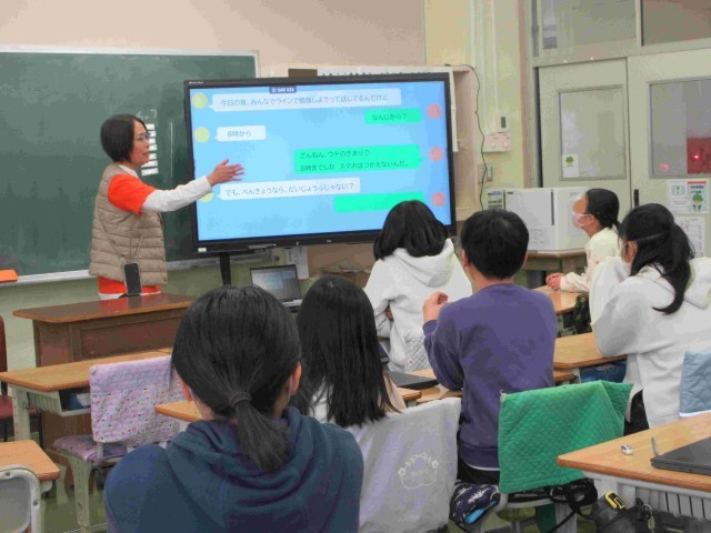 2月10日。今日は、5年生が体験型安全教室を行いました。今日の学習は、「おこのみやきそうす」「SNSの使い方」でした。昨日と今日の二日間で、全校児童が発達段階に応じて、「不審者対応」や「SNSに潜む危険」について学習しました。