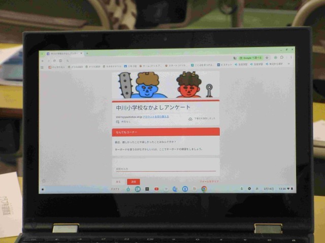 なかよしアンケート 公開日 2026/02/16 更新日 2026/02/16 学校生活のようす 2月16日。中川小学校では、毎月、「なかよしアンケート」が行われます。いじめのことや先生に相談したいことがあるかなどを聞いています。このアンケートの時に限らず、中川小はいつでも相談できるようにしています。