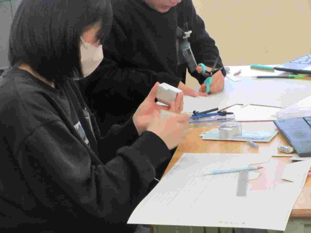 3月10日。4年生は算数「箱の形の特ちょうを調べよう[直方体と立方体]」、5年生は算数「立体をくわしく調べよう [角柱と円柱]」を学習しています。直方体の箱を作るには何がわかればいいのか、三角柱を作ろうに取り組んでいました。