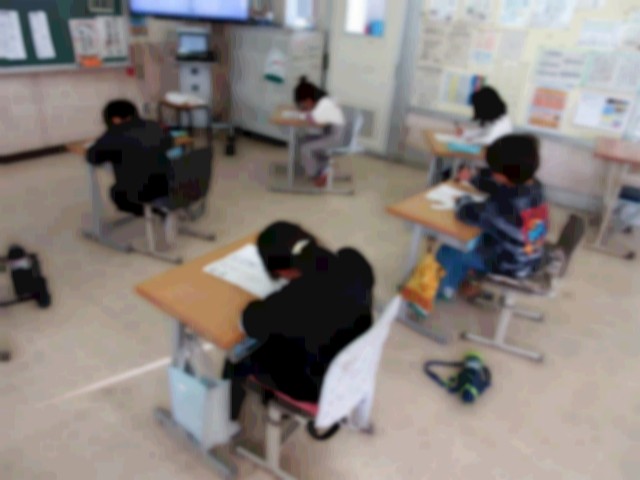校内書初め競書会 低学年は、「元気なあいさつ」と「お正月」をフェルトペンで清書しました。最後まで集中して、ゆっくり大きく文字を書いていました。