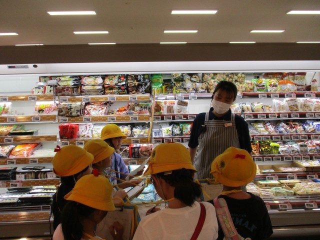 店員さんにお話を聞いたり、バックヤードを見学したりしました。ふだんは見られないスーパーの裏側を見ることができて、児童のみなさんは興味深くお話を聞いている様子でした。