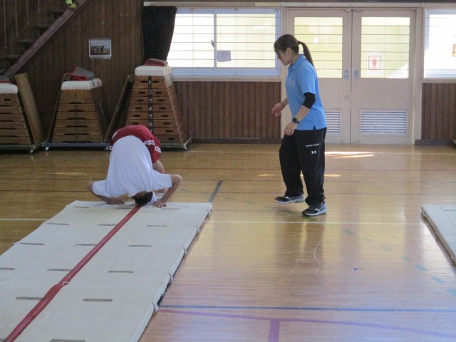 6年3組でマット運動の授業を行い、前転や側転のやり方を教えてくださいました。みなさん真剣に先生の話を聞いている様子で、楽しく学習することができました!