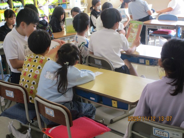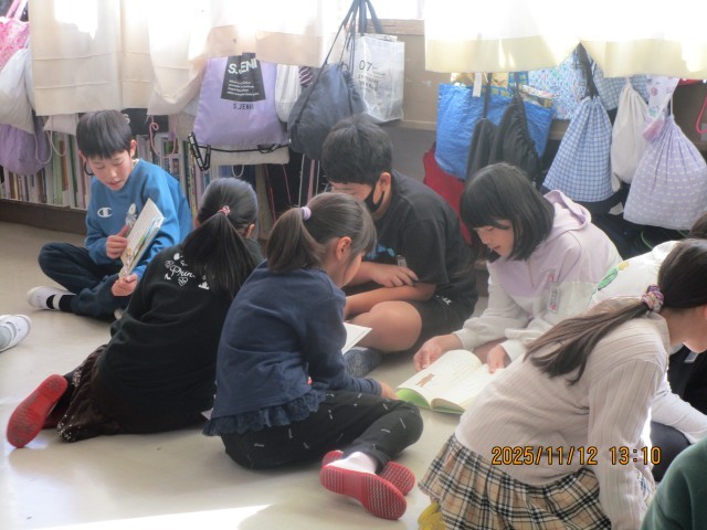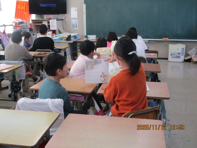 12日(水)、ロング昼休みにたてわり読書がありました。これは、6年生から1年生、5年生から2年生、4年生から3年生に読み聞かせをする取組です。とても心温まる時間でした。今月は、大原読書月間です。たくさんの本に触れる機会があるといいですね。