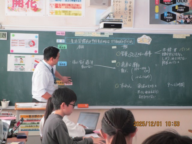 1日(月)、5年生「ソフトバレーボール」、6年生「保健」で公開授業がありました。ソフトバレーボールでは、よいアタックになるようにつなげようというめあてに向かって、チームで協力して活動する姿が見られました。保健では、生活習慣病を予防するためにどうすればよいかという課題について考え、意見を伝え合い、学びを深めることができました。どちらの授業も子供たちが大変意欲的で楽しく学習に取り組み、すばらしい授業でした。