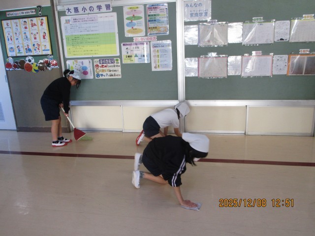 今週は、大掃除週間です。使用した教室や校舎をすみずみまできれいにし、整理整頓をするのが目的で行っています。いつも以上に一生懸命取り組んでいる様子が見られました。大原小の子供たちは、日頃から黙々清掃を行い、すばらしいと感じます。来年もきれいな環境で生活できるよう、大掃除週間を取り組んでいきましょう。