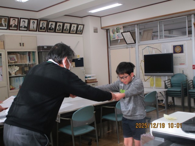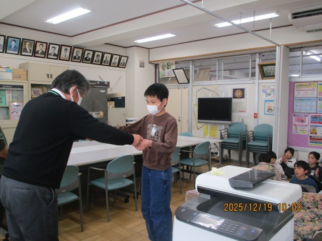 19日(金)、業間休みに校長室で大原あいさつ賞の表彰がありました。あいさつの模範となる児童(各クラス1名)が校長先生から、賞状とバッジを授与されました。賞をもらった児童はこれからも、あいさつの模範となり、あいさつのすばらしさを広めてください。ホームページ上でクリックしていただくと、4枚目以降の写真がご覧いただけます。