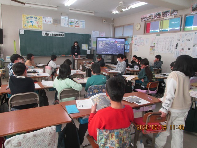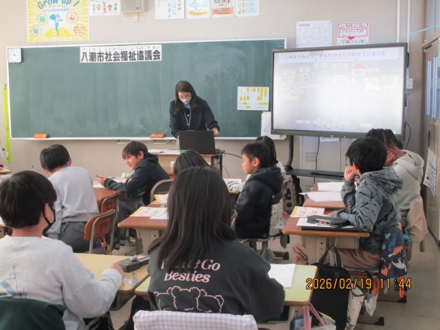 19日(木)、八潮市社会福祉協議会の方をお招きし、4年生が福祉講話を行いました。各クラス1時間ずつ実施し、福祉について学習することができました。興味をもち、お話を聞いていました。