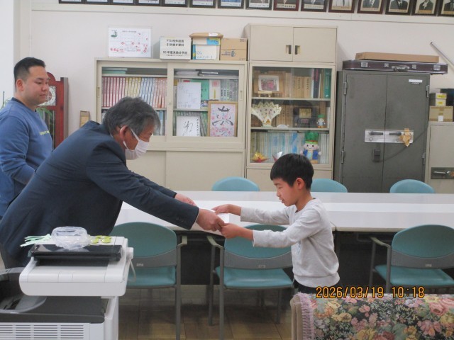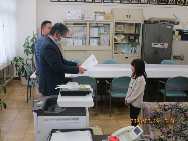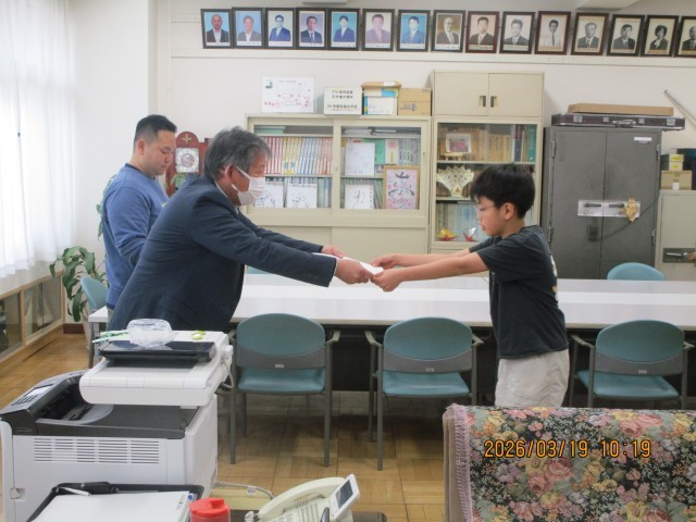 19日(木)、大原あいさつ賞の表彰が校長室でありました。本校では、日々の生活の中で、気持ちのよいあいさつができる児童を称え、「あいさつ賞」を設け、学期に1度表彰しています。「あいさつ」は人と人の心をつなぐ大切な一歩です。受賞した児童はもちろん、その姿を見た周りの児童にもよい影響が広がり、学校全体であいさつの輪が広がっていくことを願っています。これからも本校では、「あいさつで心を磨く」ことを大切にし、誰もが気持ちよく過ごせるよう学校づくりを進めていきます。