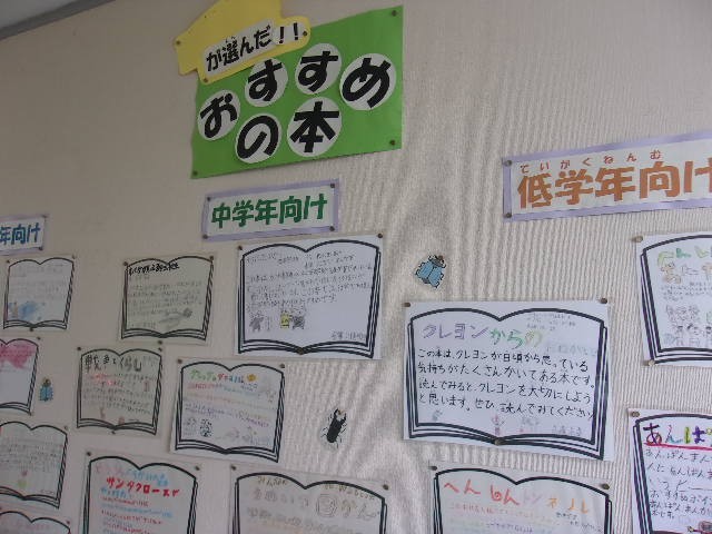 五年生の音楽を参観しました。今月の歌「さんぽ」を元気よく歌っていました。みんな、落ち着いて学習に取り組み、音楽の楽しさを学ぶことができていました。また、図書室前の掲示物がとても美しいので写真で紹介をします。柳之宮小学校では読書活動を推進しています。