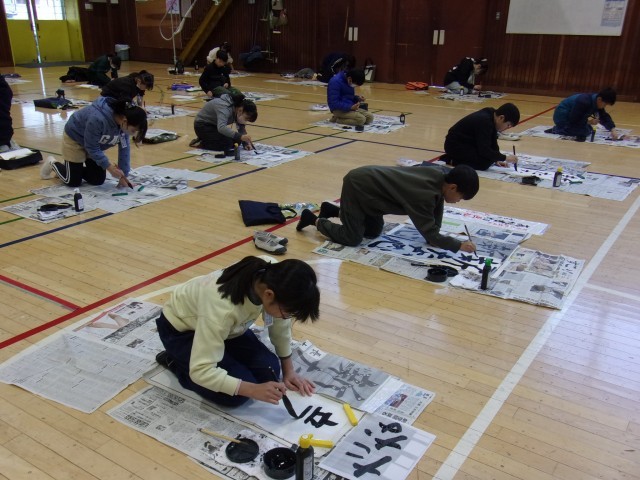 本日、5・6年生が校内書初め会を行いました。子どもたちは、心を落ち着かせ集中して筆を運んでいて、立派な作品が仕上がりました。