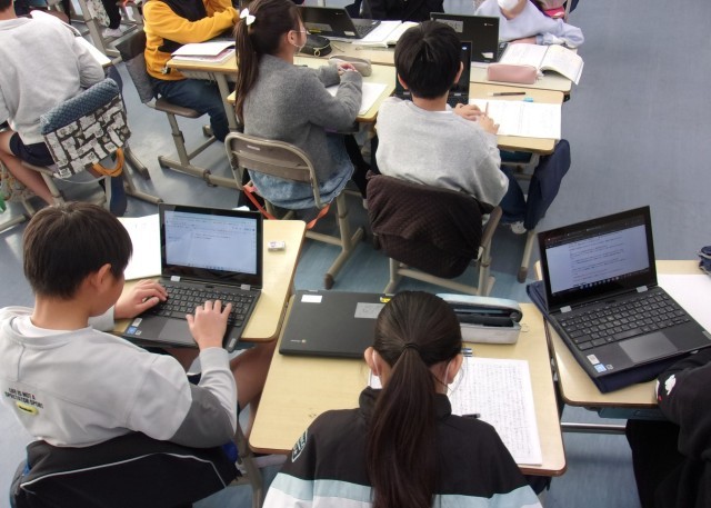 5年1組の授業の様子です。国語で自分で決めたテーマについて探求学習を行っています。探求したことをもとに文章にまとめています。