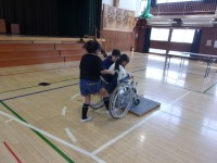 4年生は、社会福祉協議会の方をお招きし、車いす体験を行いました。乗っている人の...