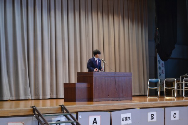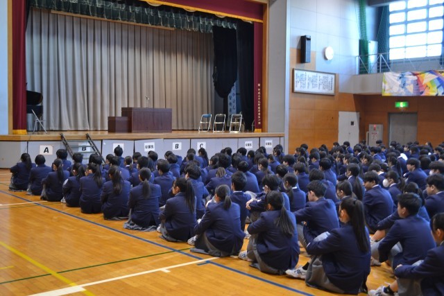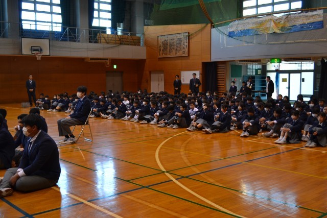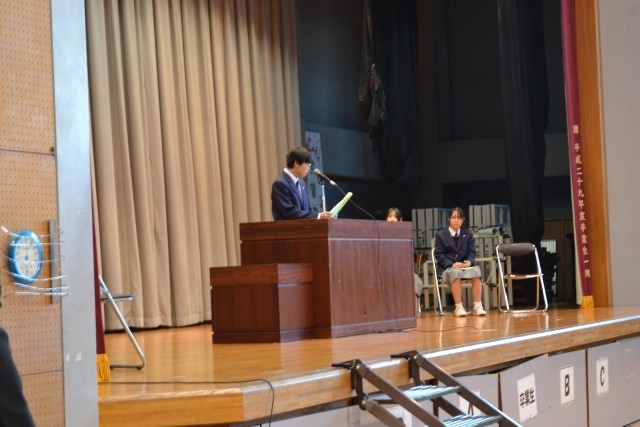 初日は、体育館に全校生徒が集まり、始業式を行いました。始業式では、各学年から代表生徒が抱負を発表し、校長の話・校歌斉唱が行われました。終了後、表彰を行い、最後に青少年の主張大会で優勝した生徒の発表がありました。