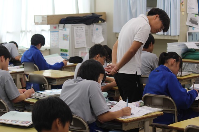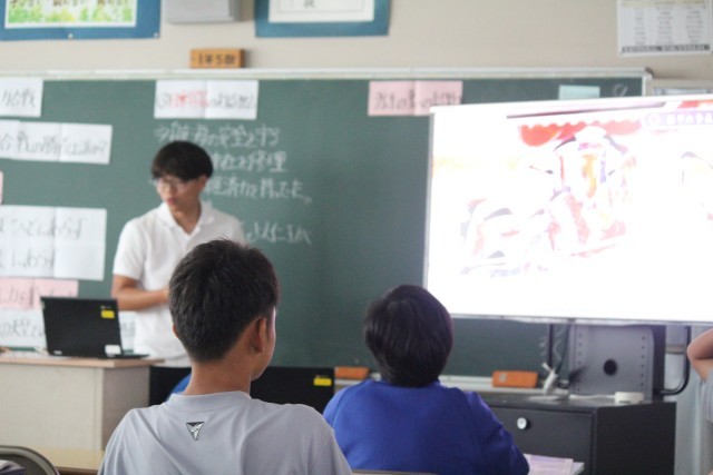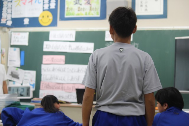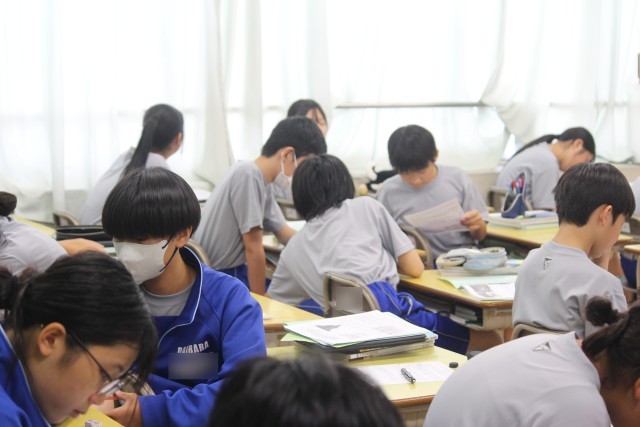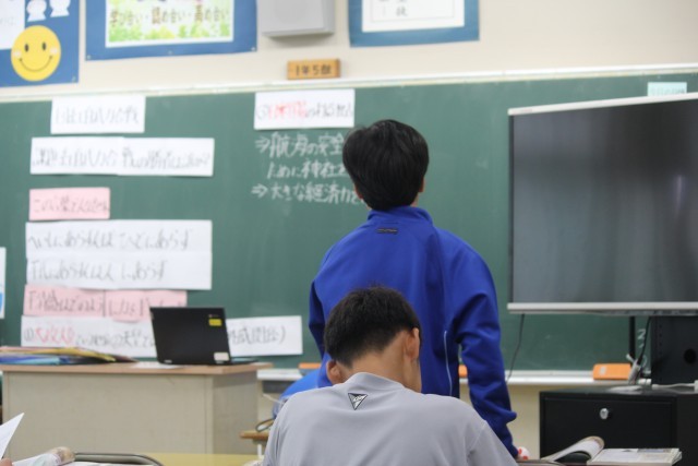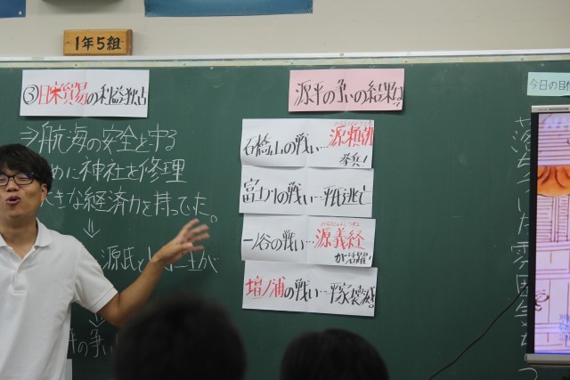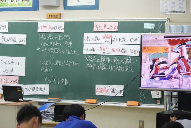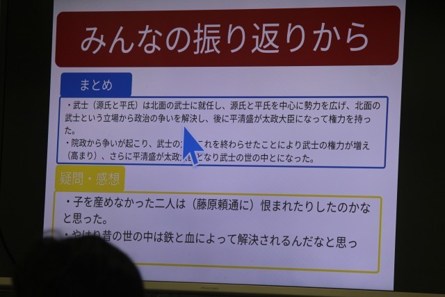 1年生の社会科では、「みんなの振り返り」で前時までの学習内容を想起し、「『平家にあらずんば人にあらず』という言葉はどんな意味だろうか?」という発問から課題に入っていきました。「武士の政権の成立 紅白武力合戦」という面白い切り口でした。資料の読み取りから自分の考えをまとめ、友達と共有した後の発表は、とても立派でした。