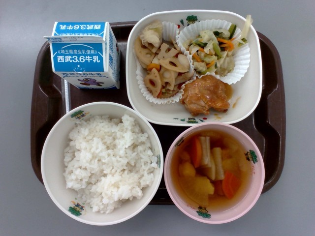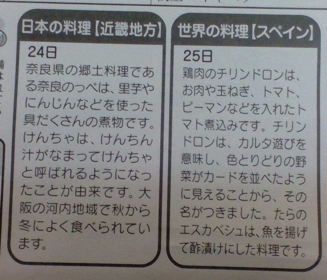 今日のメニューは「日本の郷土料理 近畿地方」というテーマで、「ごはん」「鶏肉のみそ焼き」「奈良のっぺ」「小松菜の梅風味煮」「けんちゃ」「牛乳」でした。八潮市 学校給食献立表には、写真のように説明がありました。今日もおいしくいただきました。明日の給食は「世界の料理 スペイン」です。楽しみですね。
