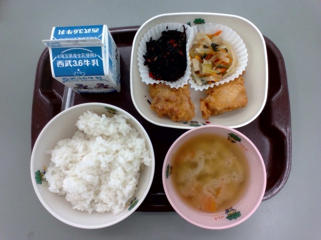 9月26日(金) ハッピーこまちゃんデー 公開日 2025/09/26 更新日 2025/09/26 給食 今日のメニューは、「ごはん」「鶏肉のから揚げ」「こまちゃんの煮浸し」「ひじきの炒め煮」「みそ汁」「牛乳」でした。今日は「ハッピーこまちゃんデー」で、「こまちゃんの煮浸し」に八潮市産の「小松菜」が使われています。本日も美味しくいただきました。