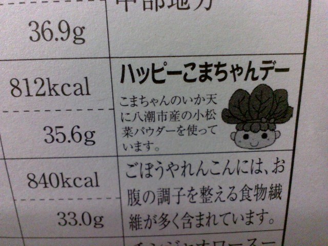 今日の給食のメニューは、「ごはん」「こまちゃんのいか天」「炒りたまご」「コーンクリーミーサラダ」「みそ汁」「牛乳」でした。「こまちゃんのいか天」は、八潮市産の小松菜パウダーを使用しています。大変おいしくいただきました。ごちそうさまでした。