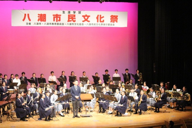 11月1日(土)に、第51回八潮市民文化祭が八潮メセナで開催され、本校吹奏楽部が出場しました。開会式前のオープニングセレモニーで八潮中と2校合同バンドを結成し、オープニングに花をそえました。開会式後、ステージの部でトップバッターとして「大原中セレクション2025」の演奏を披露しました。会場の皆さんから大きな拍手をいただき、市民文化祭にふさわしい素敵な催しとなりました。