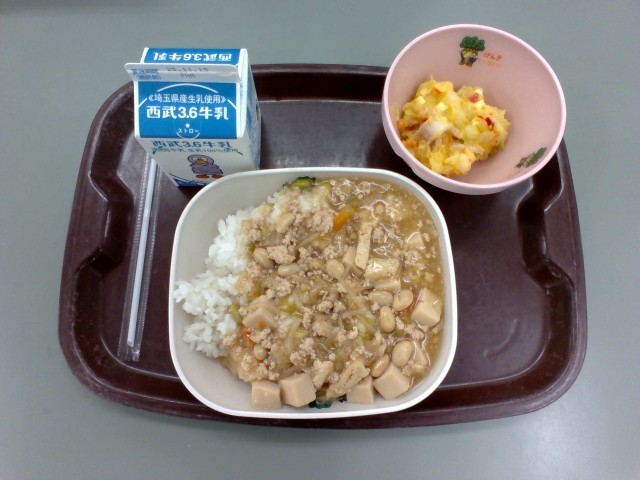 本日の給食のメニューは「すがたをかえる大豆丼」「かぼちゃのクリーミーサラダ」「牛乳」でした。八潮市教育委員会作成の学校給食予定献立表(11月)の「ワンポイントアドバイス」には、「『すがたをかえる大豆丼』には、大豆を加工した食品がたくさん入っています。」と記されています。大豆、豆腐、油揚げ、味噌がふんだんに使われ、大変美味しかったです。ごちそうさまでした。