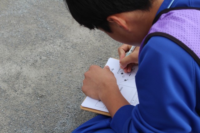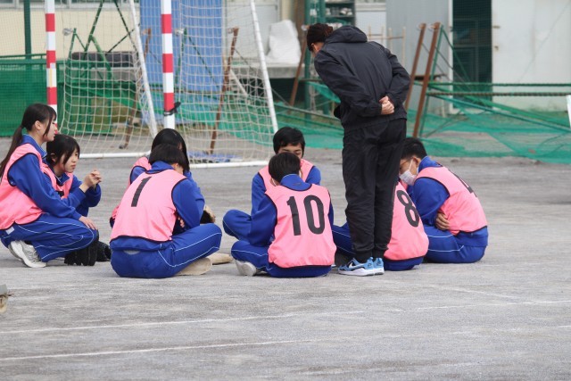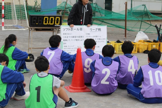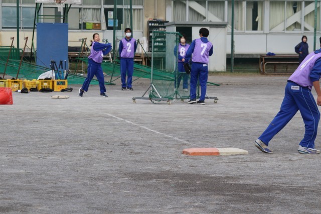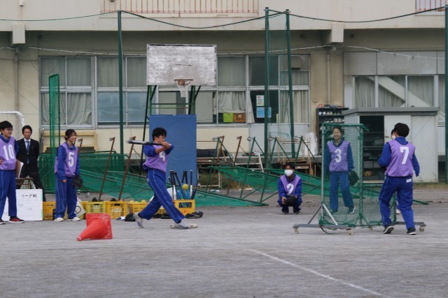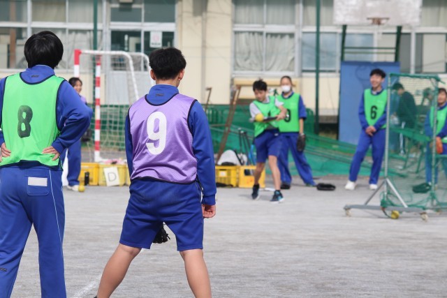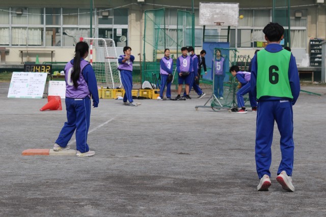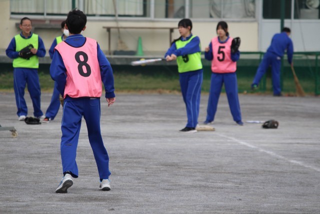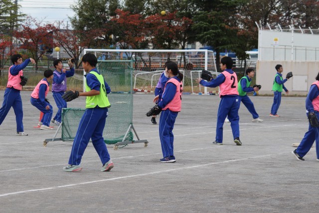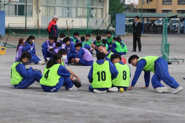 市内中学校の先生を指導者としてお迎えして、3年生の保健体育「ソフトボール」で研究授業を行いました。男女共習の授業で、本時がソフトボール最後の授業でした。集団がしっかりとした雰囲気でチームの仲間と助け合い、お互いにアドバイスし合い、とてもよい雰囲気でした。さすが、3年生です。本時の目標は、「作戦に応じたボール操作で攻撃や守備を行い、仲間と連携したゲーム展開ができる。」でした。こんな場面がありました。センターを守る女子生徒がレフトとセンターの間に落ちそうな打球を予想して、回り込んでキャッチし、チームメイトの指示もありましたが、自ら2塁上で待つチームメイトに送球。進塁をゆるしませんでした。「仲間と連携したゲーム展開ができる」◎だと思いました。