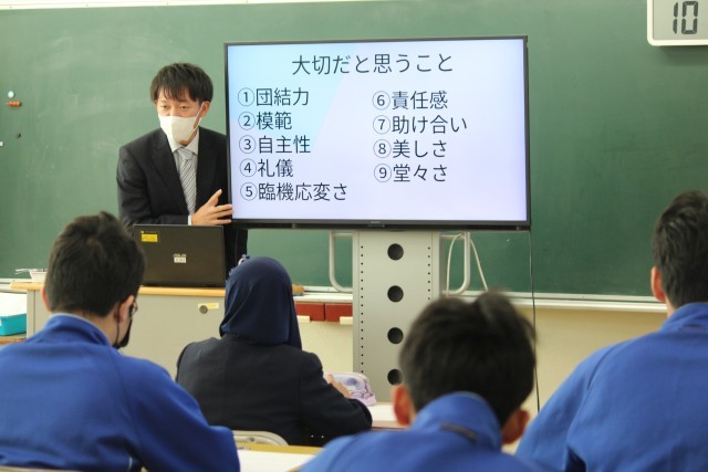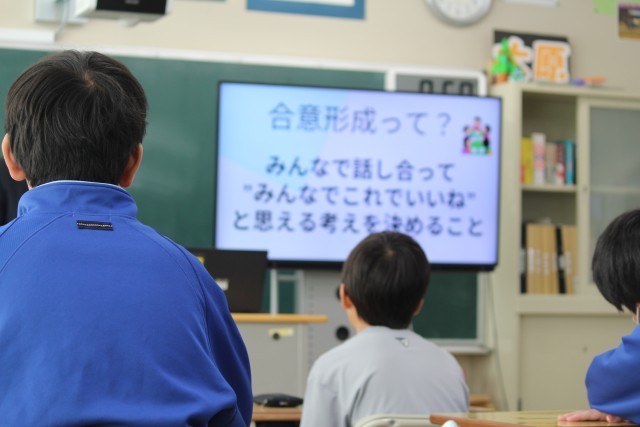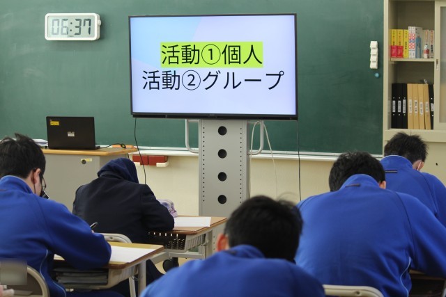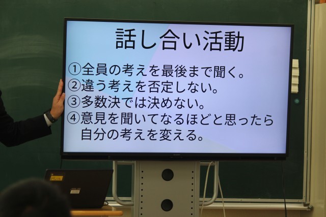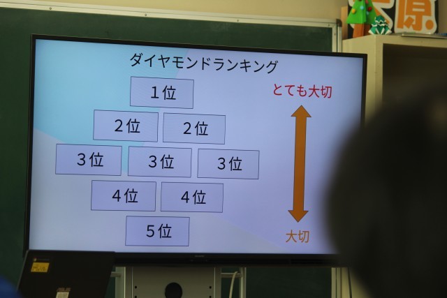 授業では、発表会を成功させるために大切なこととして、まず「合意形成」という言葉の意味を学びました。次に個人で考え、合意形成のために、大切なことに優先順位をつける「ダイヤモンド・ランキング」を作成しました。話し合い活動では、ダイヤモンド・ランキングをもとに「模範を一番に選びました。なぜなら、私は、小学生のお手本になりたいからです。」など、根拠をしっかりと持ち自分の意見を述べていました。話し合いが深まってくると「やはり、団結力が根底にあって、その上に模範、助け合い、美しさ、臨機応変さ・・などが出てくるのではないか」というような意見が出ました。まとめでは、生徒から「よい発表会になりそう」という発言がありました。