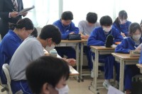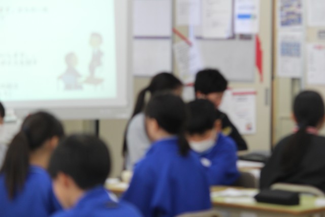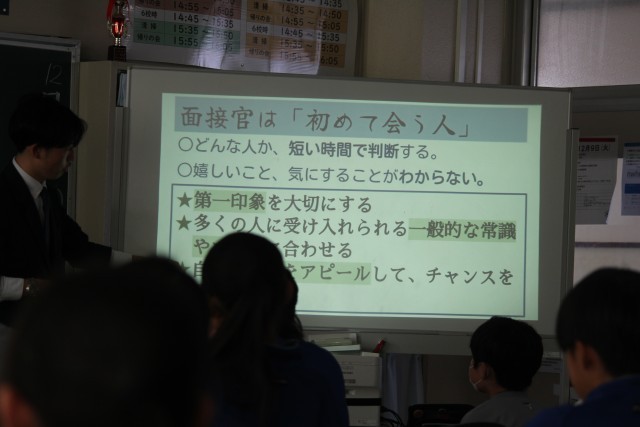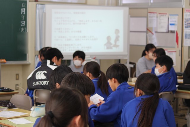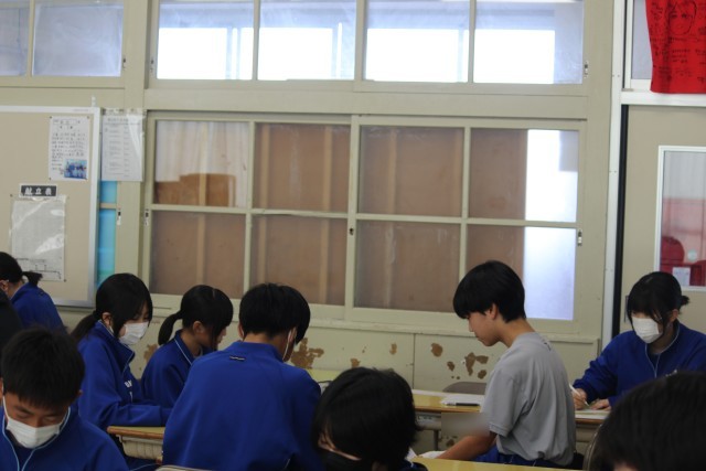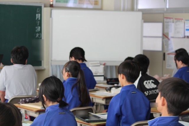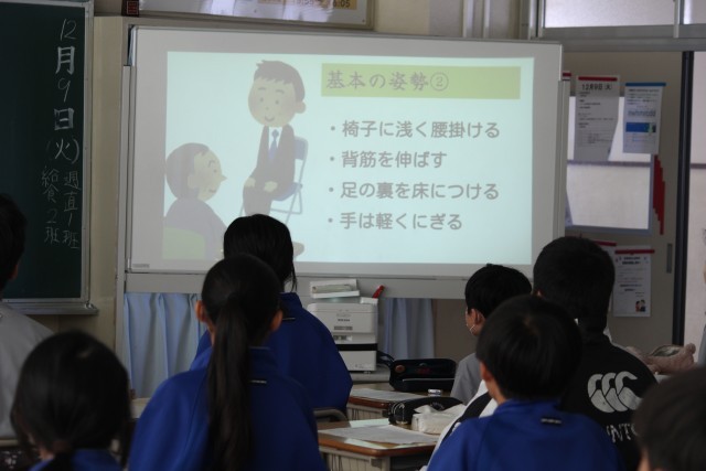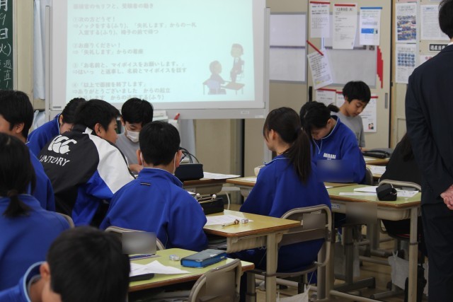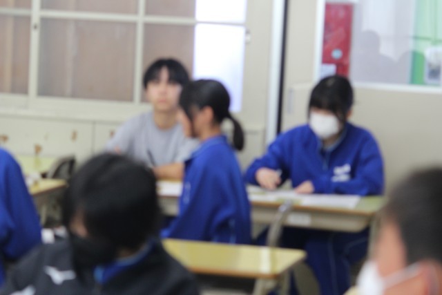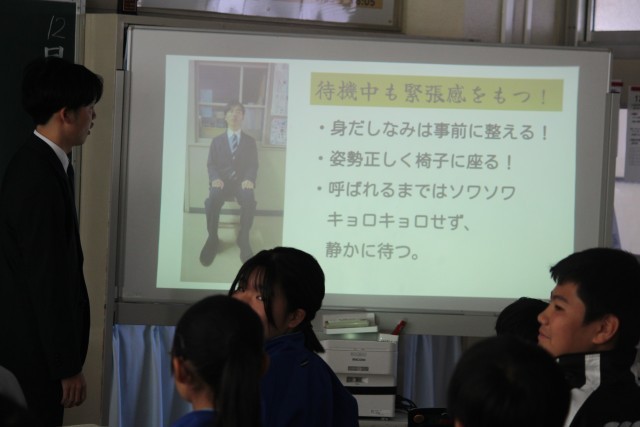 題材は「自分の良さや考えを伝える」でした。過日発出された1年生の学年通信「みんなの「いっぽ」」にも掲載されていますが、現在の中学2年生の埼玉県公立高等学校入学者選抜から入試制度が変わり、自己を表現する時間が新設されました。面接の最初に、受験生から話す時間が1分30秒〜2分程度設けられるそうです。本時では、自分のよさをアピールしながら、グループで模擬面接に取り組みました。「自分の良さや考えを伝える」ことは、入試の面接のみならず、今後の人生において必要な技能です。その意味をよく考え、日々の授業や活動に取り組みましょう。