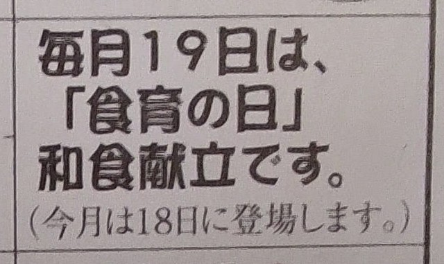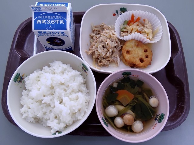 八潮市では、毎月19日を「食育の日」と定めています。学校では12月19日がクリスマスメニューのため、今日が「食育の日」の和食献立でした。今日の献立は「ごはん」「豚肉のみそ炒め」「れんこんのはさみ揚げ」「大根の五目煮」「すまし汁」「牛乳」です。煮物もすまし汁も出汁が効いており、たいへん美味しかったです。ごちそうさまでした。