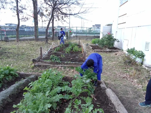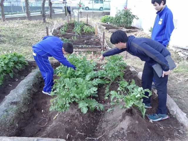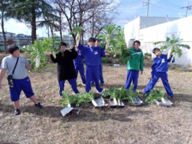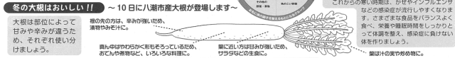 本日、しえん学級の皆さんが大変大きく立派な大根を収穫しました。収穫した大根は、早速みんなで食べました。カットして何もつけずに食べたら、「甘い!」「おいしい!」と驚いたり、収穫の喜びを噛み締めていました。給食でも「地場産(八潮市産)大根のすまし汁」が12月10日(水)に提供されましたが、八潮市教育委員会発行の学校給食献立表12月分には「冬の大根はおいしい!!」と特集がありましたので、併せてその記事も紹介いたします。