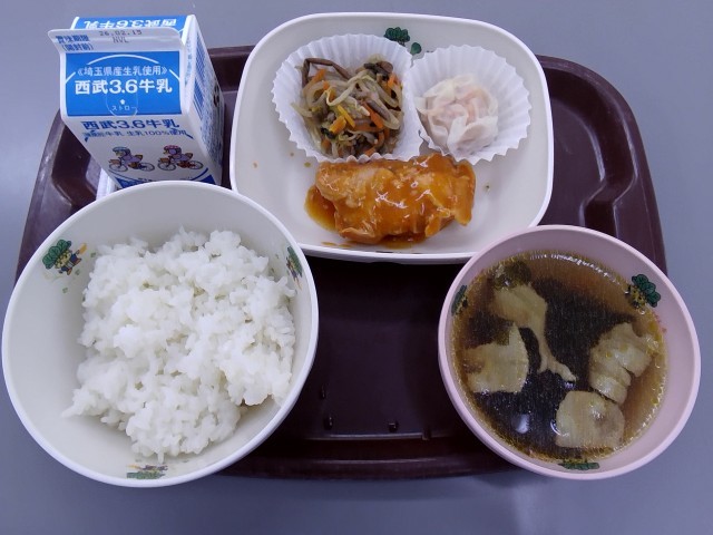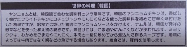 今日の献立は「世界の料理・韓国」というテーマで、「鶏肉のヤンニョムソース」「海鮮シュウマイ」「ナムル」「ミヨックク風ごまわかめスープ」「ごはん」「牛乳」でした。スープからはごま油の良い香りが、おかずは食欲をそそる色の組み合わせが、それぞれ食べる前から美味しかったです。もちろん味も大変良かったです。ごちそうさまでした。