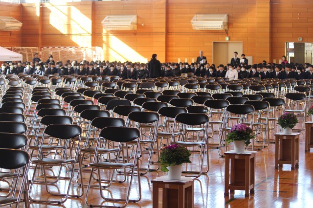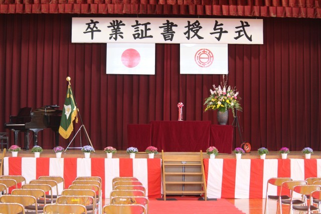 写真は、卒業式準備と、準備が終わった後、明日の卒業式を静かに待つ会場の様子です。ホームページ上で写真をクリックしていただくと、4枚目以降の写真がご覧いただけます。