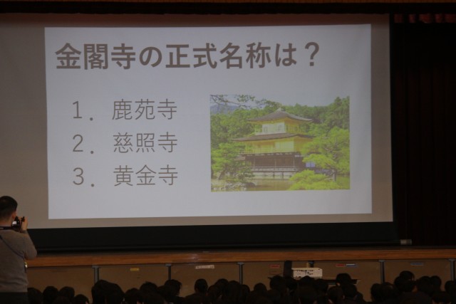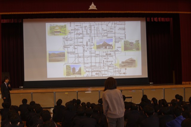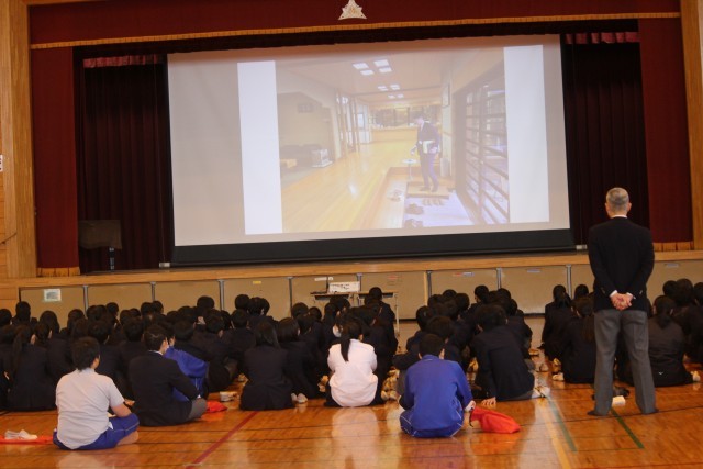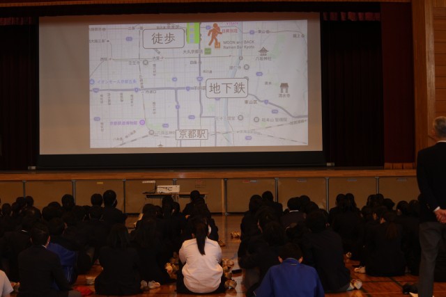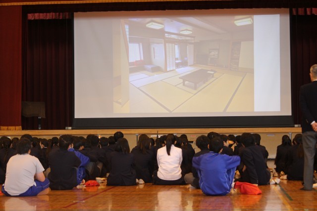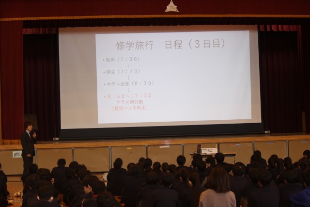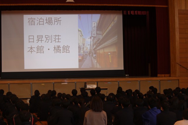 本日より修学旅行の事前学習(集会)が始まりました。先生の説明を真剣に聞きながらも、趣のある宿泊場所の画像が映ると「オー」と声があがっていました。