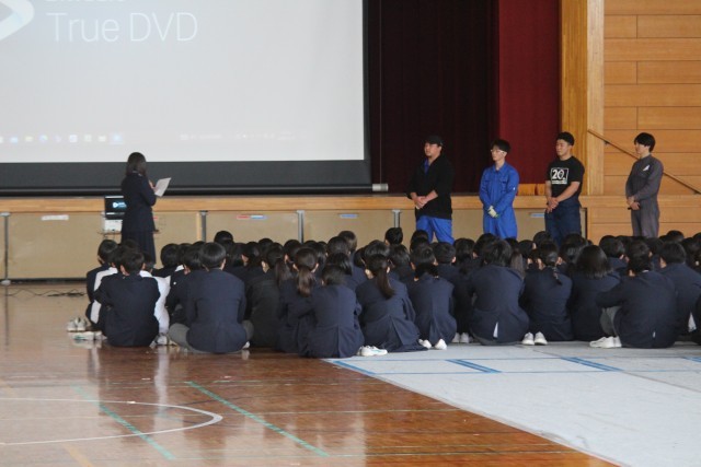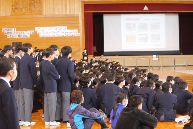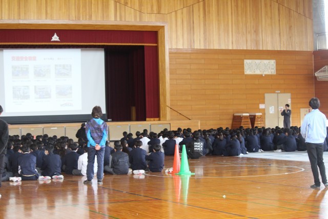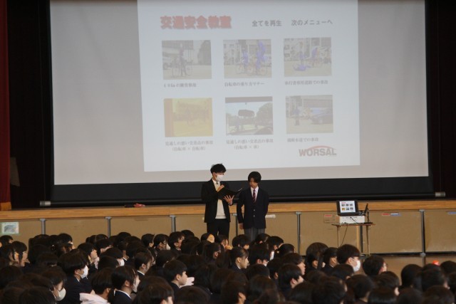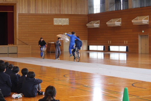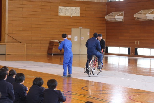 本日4校時に、体育館で自転車交通安全教育(スケアード・ストレイト)を開催しました。「スケアード・ストレイト」とは、怖い思い、ヒヤッとする体験を通じて啓発効果を高める教育技法です。具体的には、スタントマンによるリアルな交通事故再現という手法を取り入れたものです。春休みを前に、交通ルールと正しい交通マナーの理解により、交通事故を未然に防ぐことを目的としています。