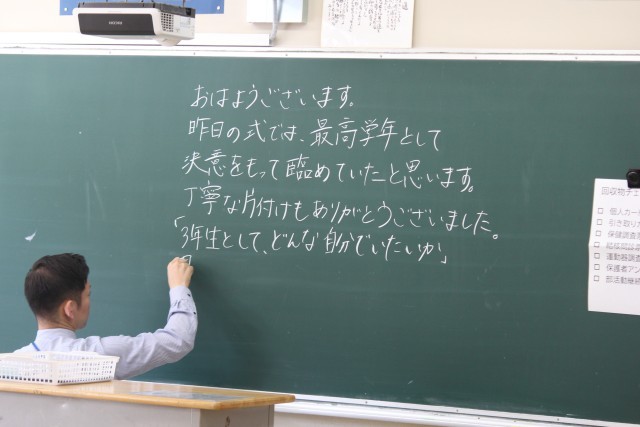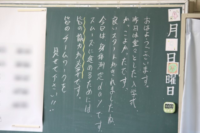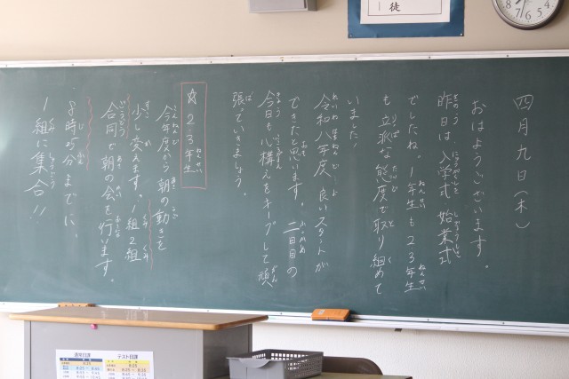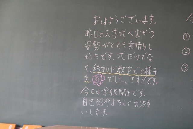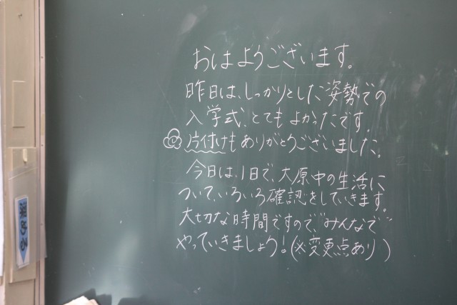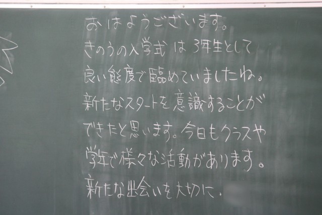 2、3年生は今日が「学級開き」でした。1年生は、身体計測、聴力検査、視力検査などがあり、明日が「学級開き」です。放課後は、安全集会と自転車点検がありました。明日から給食も始まります。写真は、朝の教室に書かれていた先生方からのメッセージです。ホームページ上で写真をクリックしていただくと、4枚目以降の写真をご覧いただけます。