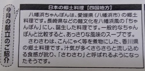今日の献立は、日本の郷土料理【四国地方】というテーマで、「八幡浜ちゃんぽん」「ハムかつ」「さわさわ」「ほうれん草のおかか和え」「牛乳」でした。八幡浜ちゃんぽんはあっさりした味付けの中にもしっかりと魚介の風味があり、具だくさんで食べ応え抜群でした。その他の献立もとても美味しくいただきました。ごちそうさまでした。