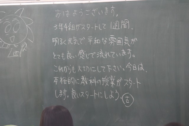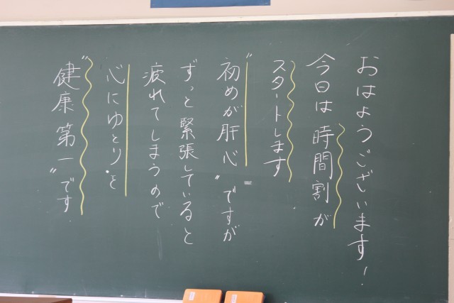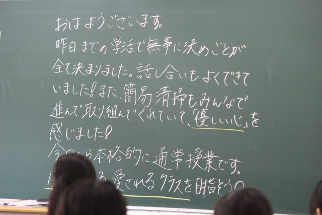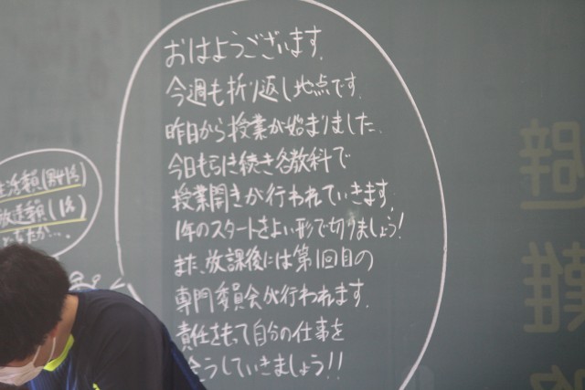 生徒会役員による「朝のあいさつ運動」のそばで、環境委員の生徒が植物に水やりをしています。清々しい大原中の朝の始まりです。朝読書の時間も素晴らしかったです。本日から授業がはじまり、オリエンテーションが多くありました。一週間も折り返しです。季節の変わり目に体調を崩すことのないよう、気をつけて過ごしましょう。写真は、朝のあいさつ運動、環境委員の活動の様子、教室の朝の板書です。ホームページ上で写真をクリックしていただくと4枚目以降の写真がご覧いただけます。