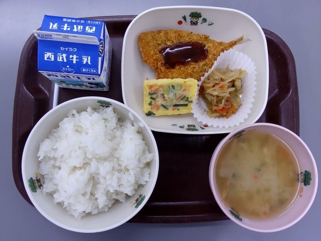 今日の献立は、「ごはん」「アジフライ」「ちぐさ焼き」「切り干し大根の煮物」「たけのことごぼうのかみかみみそ汁」「牛乳」でした。八潮市の学校給食では、食に関する指導を通じ、健康についても学ぶ機会として「よく噛んで食べる」ことの大切さを意識づけさせるために「かみかみデー」を実施しています。「たけのことごぼうのかみかみみそ汁」はシャキシャキとした食感でとても噛み応えがあり、とても美味しくいただきました。ごちそうさまでした。