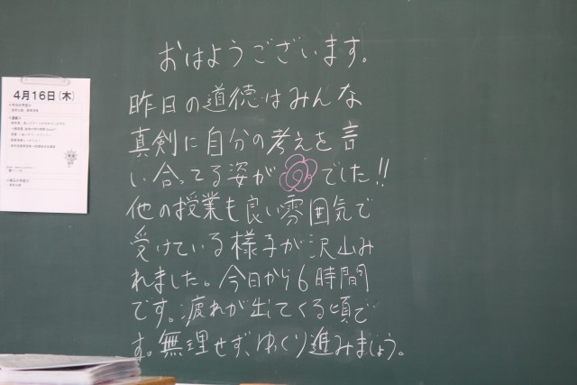 4月16日(木) 朝の黒板のメッセージと授業の様子(1/2)