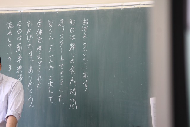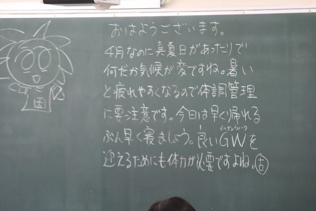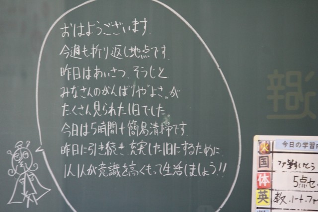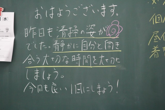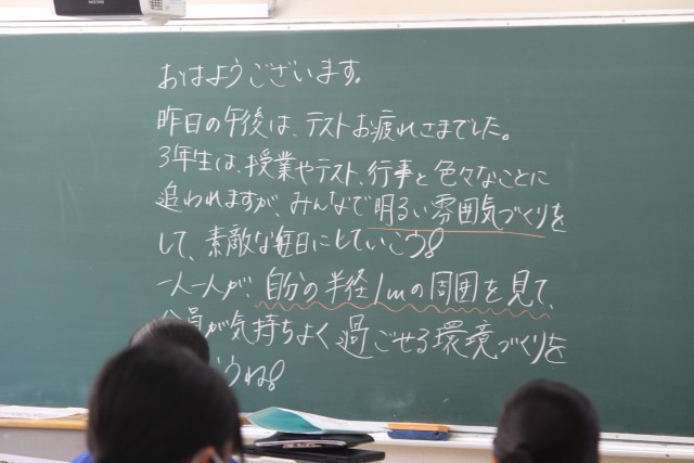 水曜日は生徒会のあいさつ運動があります。あいさつボランティアのみなさんもいらして、朝から元気なあいさつが飛び交います。その横で環境委員の皆さんが草花の世話をしてくれています。先生方の朝の黒板メッセージも掲載しました。朝読書の雰囲気が素晴らしいです。