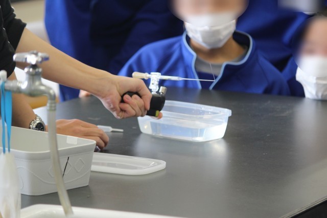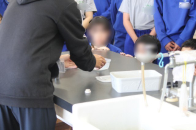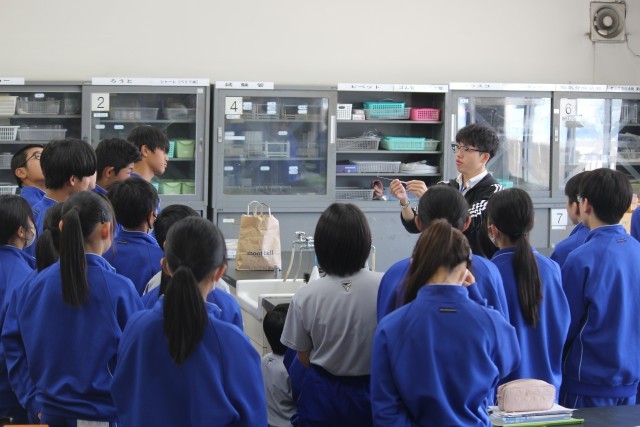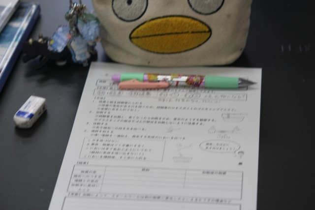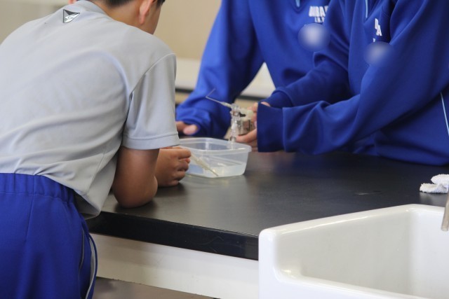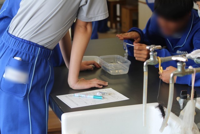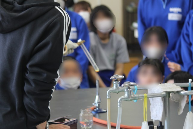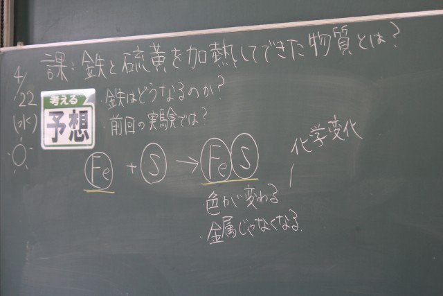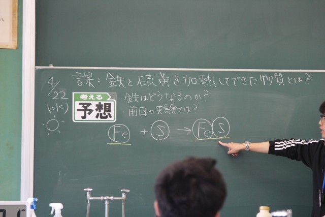2年生の理科では、「鉄と硫黄を加熱してできた物質とは?」という課題について、前回学んだ原子のモデルをもとに、どのような結果になるかを予想し、実験を行いました。方法の1番目として、硫黄と鉄を試験管に入れ加熱する、2番目として、発生した物質をうすい塩酸につける・・・。実は、この実験では、全国的に事故が発生しています。大原中では、先生が研修を行い装置を工夫することによって、発生する気体を1/10以下に抑えています。先生が実演する時も、生徒の皆さんは真剣でした。協力して安全に実験を進めることができました。